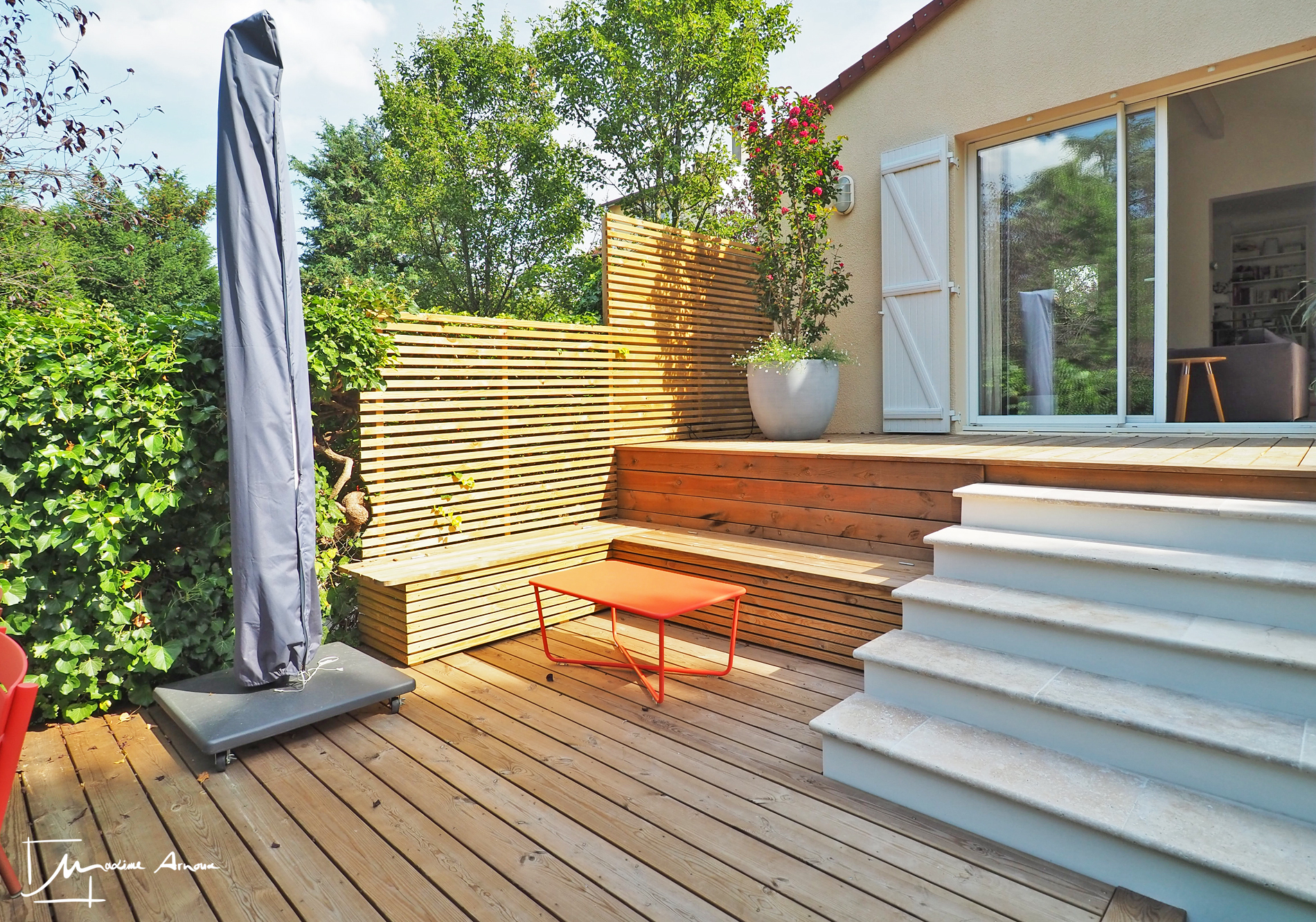 En pilotis sur le jardin, la terrasse bois permet d'accueillir une table avec chaise ainsi qu'une banquette coffre en angle réalisée sur mesure, le tout sur un jardin en pente.