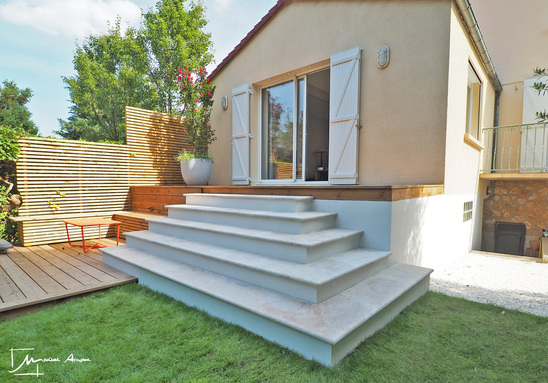 Pour des raisons d'intimité, un brise vue contemporain a été réalisé. La partie haute de la terrasse, qui était déjà existante, a été simplement recouverte de bois et réhaussée dans le prolongement de l'intérieur.