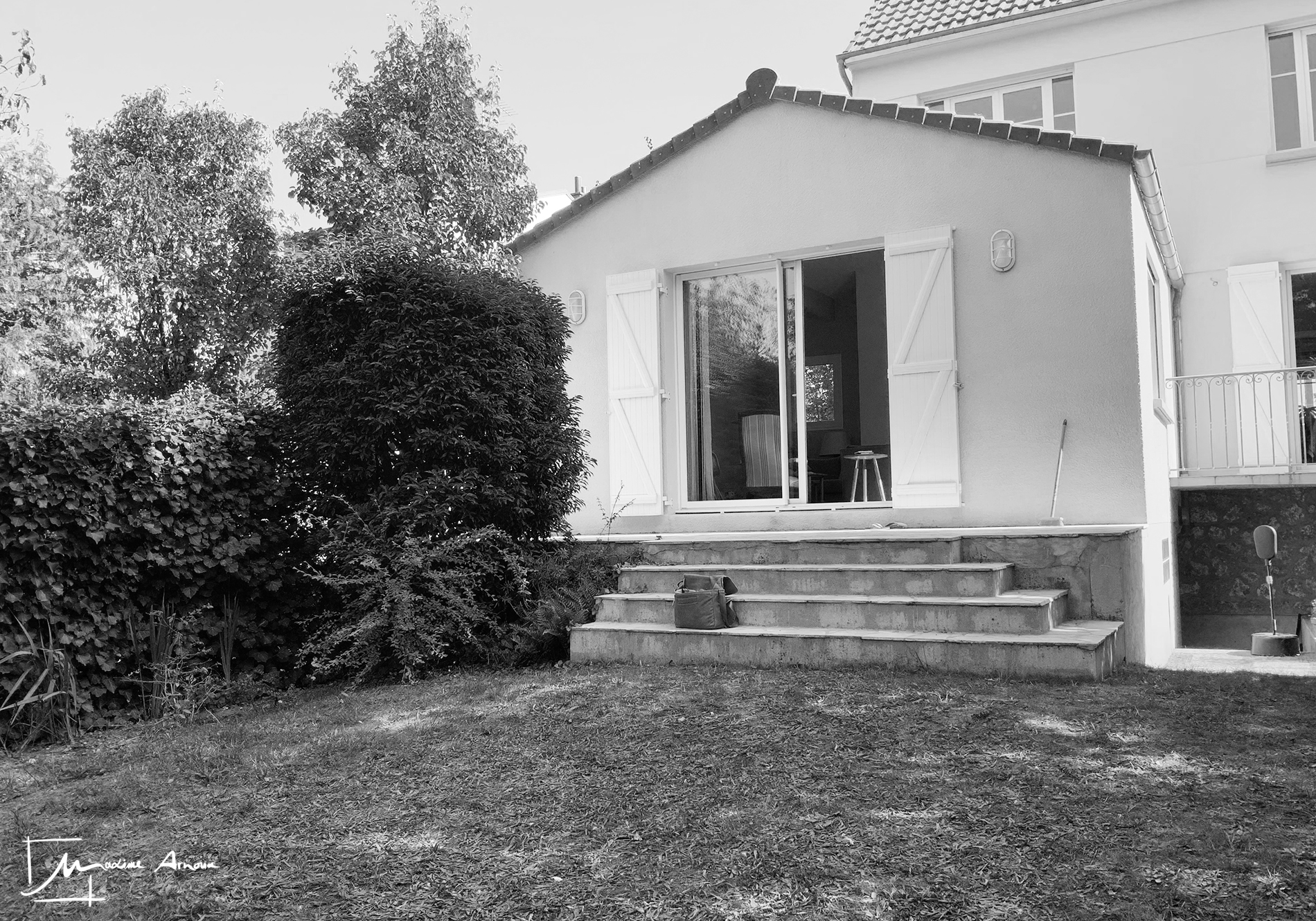 L'escalier existant à lui aussi été remanié avec un nouveau revêtement et une extension de marches pour rompre avec la monotonie du volume existant : ainsi, la dernière marche vient relier plus sensiblement le jardin à la maison.