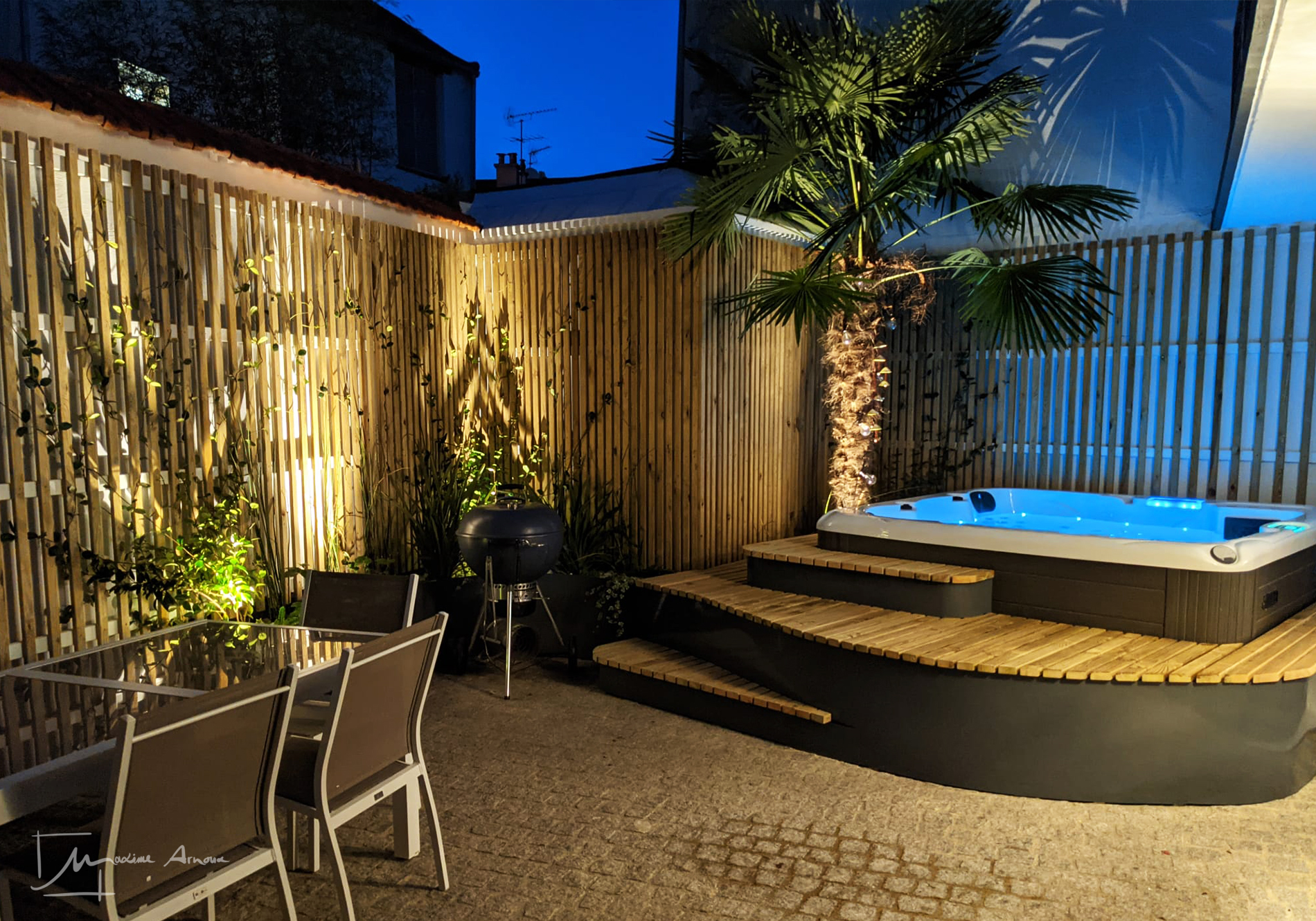 L'espace extérieur propose une partie couverte et une partie à ciel ouvert qui nous ont permis d'organiser l'espace stratégiquement. L'effet de "boîte" apportait une sensation de confinement entre 4 murs, ce qu'il fallait en priorité faire oublier.